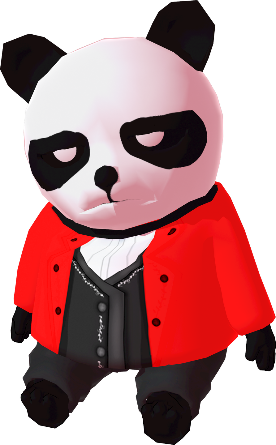 Quando é um panda, seus abraços têm o calor bem quentinho direto do Acre. Costuma utilizar roupas de mestre de cerimônias.